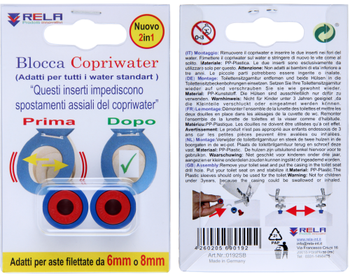 Tutti noi conosciamo questo fastidioso problema del copriwater in continuo movimento. Inserendo i due inserti del Blocca Copriwater 2in1 nei due fori del water, si rende finalmente il copriwater "inamovibile", i problemi sono terminati per sempre in soli 10 minuti. I due inserti del Blocca Copriwater 2in1 sono adatti solo per water con foro da 15 mm a 17 mm e quindi per oltre il 90% di tutte le water. L'inserto blu può essere utilizzato per barre filettate da 8 mm (M8), quello rosso per barre filettate da 6 mm (M6).