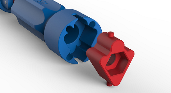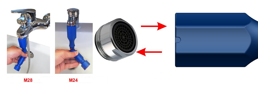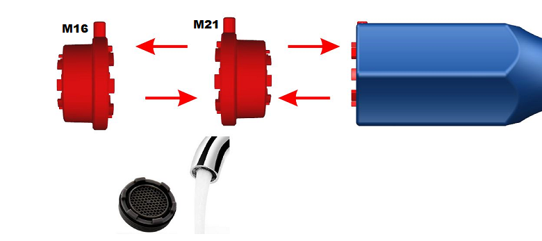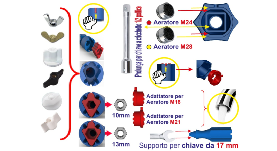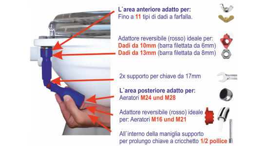 L'impugnatura della chiave ha le seguenti opzioni: Montaggio di aeratori di dimensioni M24 e M28, nonché un'opzione di montaggio interno per un'estensione chiave a cricchetto da 1/2 pollice. L'inserto rosso reversibile nell' impugnatura ha anche le seguenti opzioni: aeratore dimensioni M16 e M21. Inoltre, è disponibile anche un'opzione per una chiave fissa da 17 mm, questo dà l'opportunità di applicare forze torsionali maggiori.