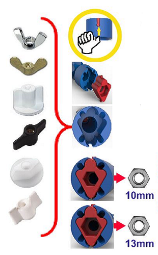 L'inserto rosso reversibile sulla testa della chiave può essere sollevato spingendo fuori l'unico perno sporgente e spinto fuori senza sforzo. Senza l'inserto reversibile rosso, puoi aprire fino a 11 diversi dadi a farfalla del copriwater o riavvitarli. Quando si reinserisce l'inserto rosso, è possibile aprire nuovamente i dadi da 10 mm (barre filettate M6) o 13 mm (barre filettate M8) o riavvitarli.