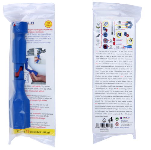 Questa Chiave universale per montaggio copriwater e installazione sanitaria (CUPM) e' un vero talento di versatilita. Questo CUPM è un bestseller, praticamente non servono strumenti aggiuntivi per aprire o riavvitare il copriwater e aeratori. Geniale, l`area anteriore con 13 possibili utilizzi e l`area posteriore con 5 possibili utilizzi, un totale di fino 19 utilizzi in una sola chiave. Questa chiave universale per montaggio copriwater e installazione sanitaria è realizzata in plastica molto robusta e resistente PA6 (poliammide-6) e rinforzata con 30% fibra di vetro.