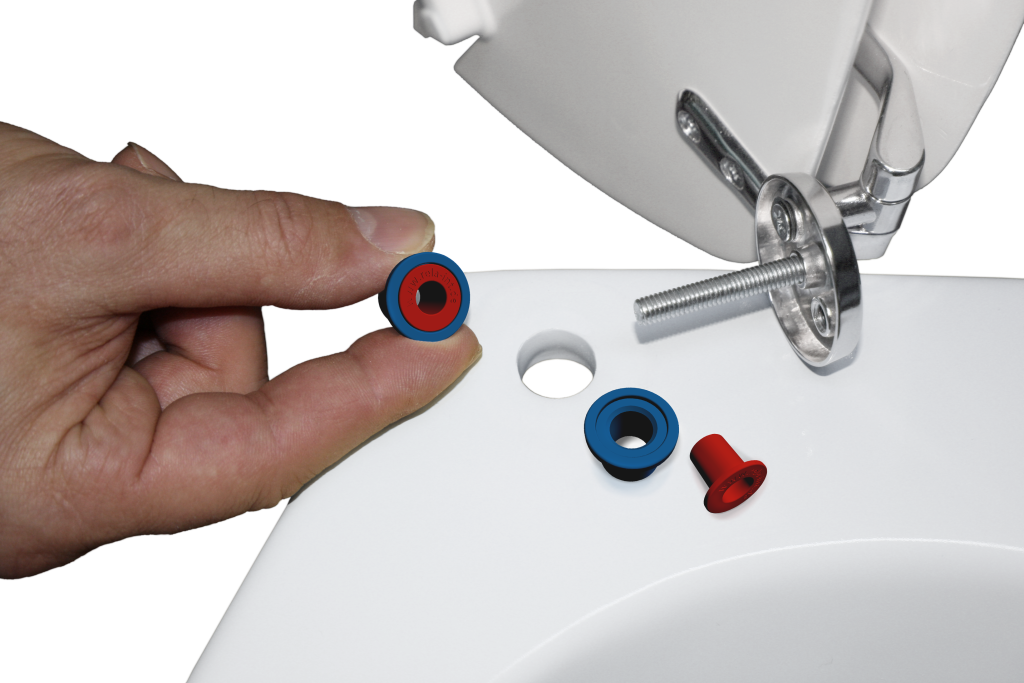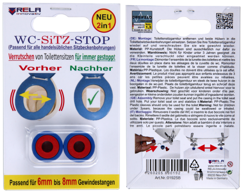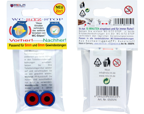 Jeder von uns kennt doch das leidige Thema vom ständig versetzten Toilettensitz. Durch das Einsetzen der zwei WSS-Hülsen in die zwei Toilettensitzbeckenbohrungen, lassen sich viele gescheiterte Versuche den Toilettensitz endgültig „unversetzbar“ zu machen in nur 10 Min. für immer beenden. Die WSS-Hülsen sind ausschließlich für handelsübliche Toilettensitzbecken mit einer Lochbohrung ab 15mm - 17mm und somit für über 90% aller Haushalte, Gastronomien aber auch für Büros geeignet. Die blaue Hülse ist verwendbar für 8mm Gewindestangen (M8) und die rote für 6mm Gewindestangen (M6).